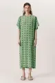 Peça feita em crepe de seda na estampa Cristal Turmalina. Vestido midi reto com shape tubo, decote redondo e mangas curtas amplas. Possui fenda na lateral e fechamento por zíper invisível no centro das costas.