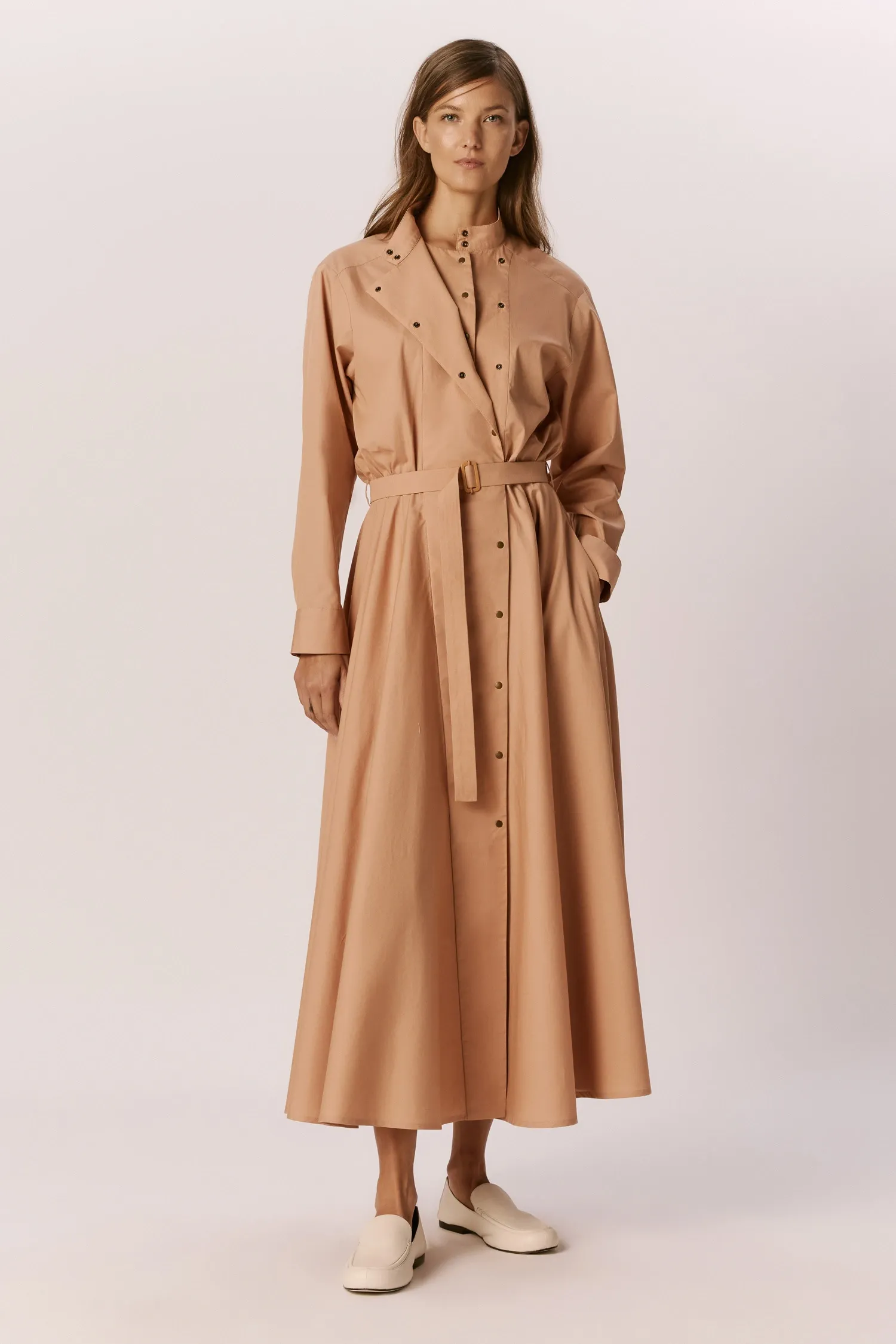 Vestido midi em tricoline de algodão na cor Tan. O modelo chemise possui saia ampla, mangas longas com punhos e gola alta. Decote frontal sobreposto com fechamento lateral por botões de pressão. Acompanha cinto faixa avulso do mesmo tecido com fivela de metal. O tecido utilizado não possui elasticidade.