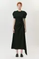Vestido midi em tricoline de algodão na cor Preta. O modelo possui modelagem justa ao corpo com decote redondo, apresenta recorte vertical na lateral do corpo com detalhe franzido que cria um efeito assimétrico e forma uma ponta alongada. Destaque para as mangas curtas com pregas, que acrescentam volume trazendo geometria à silhueta. Possui fechamento nas costas por zíper invisível.